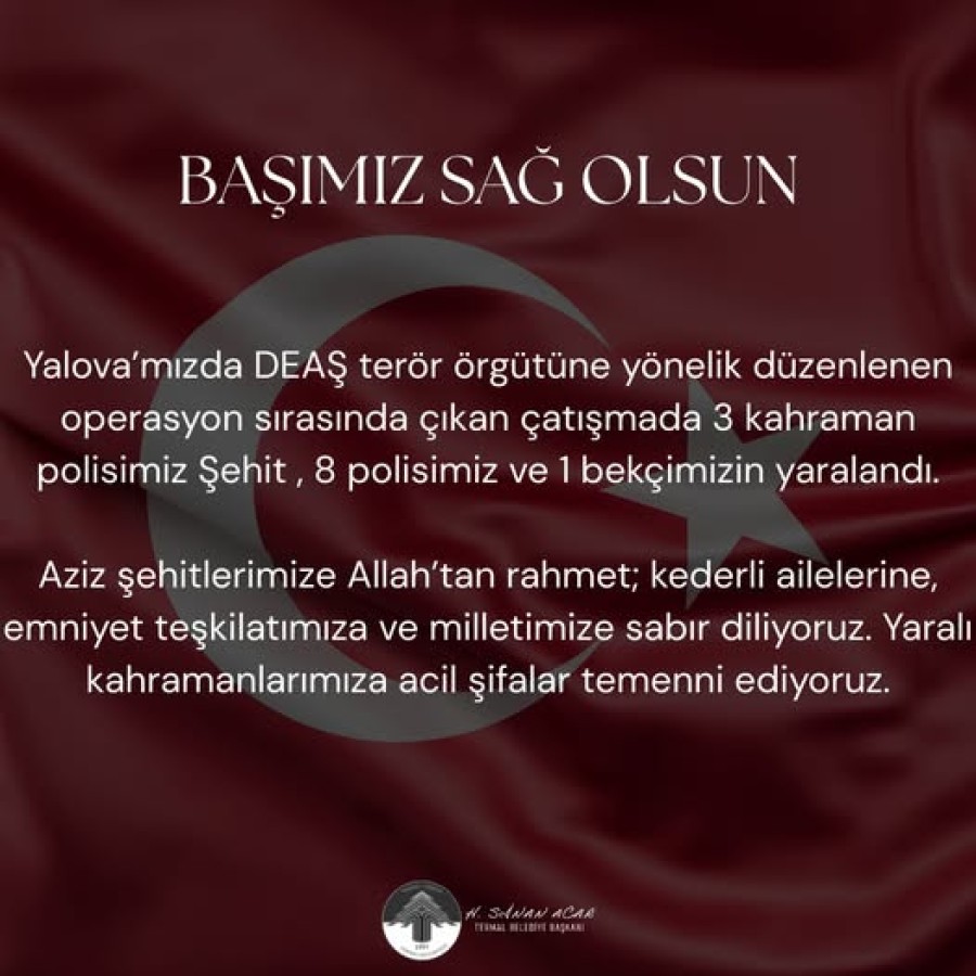 Yalova’mızda DEAŞ terör örgütüne yönelik düzenlenen operasyon sırasında çıkan çatışmada 3 kahraman polisimiz Şehit , 8 polisimiz ve 1 bekçimizin yaralandı.