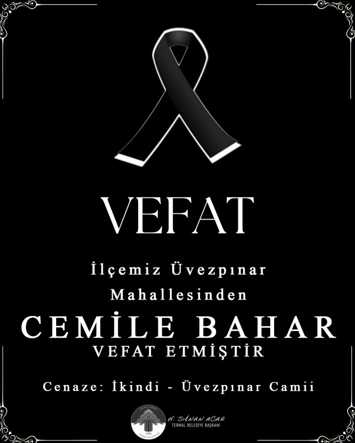 İlçemiz Üvezpınar mahallesi sakinlerinden, merhum Hüseyin Bahar, Hamit Bahar, Recep Bahar, İbrahim Bahar ve Gül Mekik'in anneleri Cemile Bahar vefat etmiştir. Cenazesi bugün ikindi namazına müteakip Üvezpınar Camii’nden kaldırılacaktır. Merhumeye Allah'tan rahmet, ailesi ve yakınlarına baş sağlığı diliyoruz. Mekânı cennet olsun.