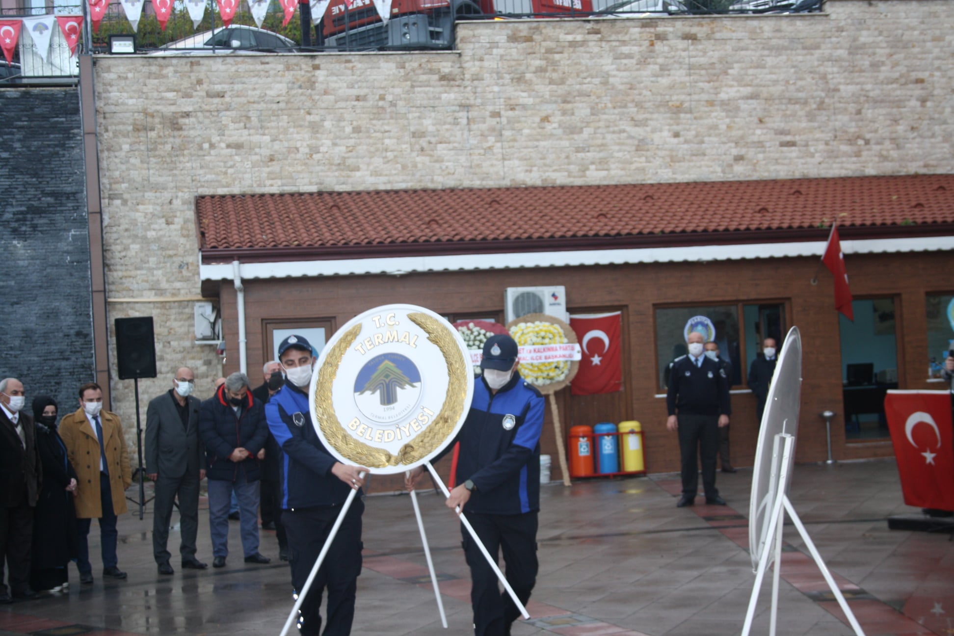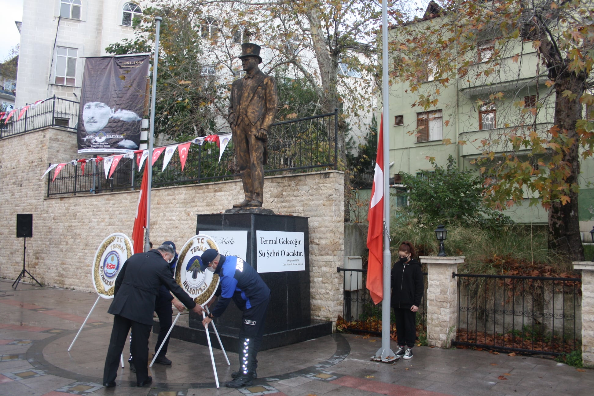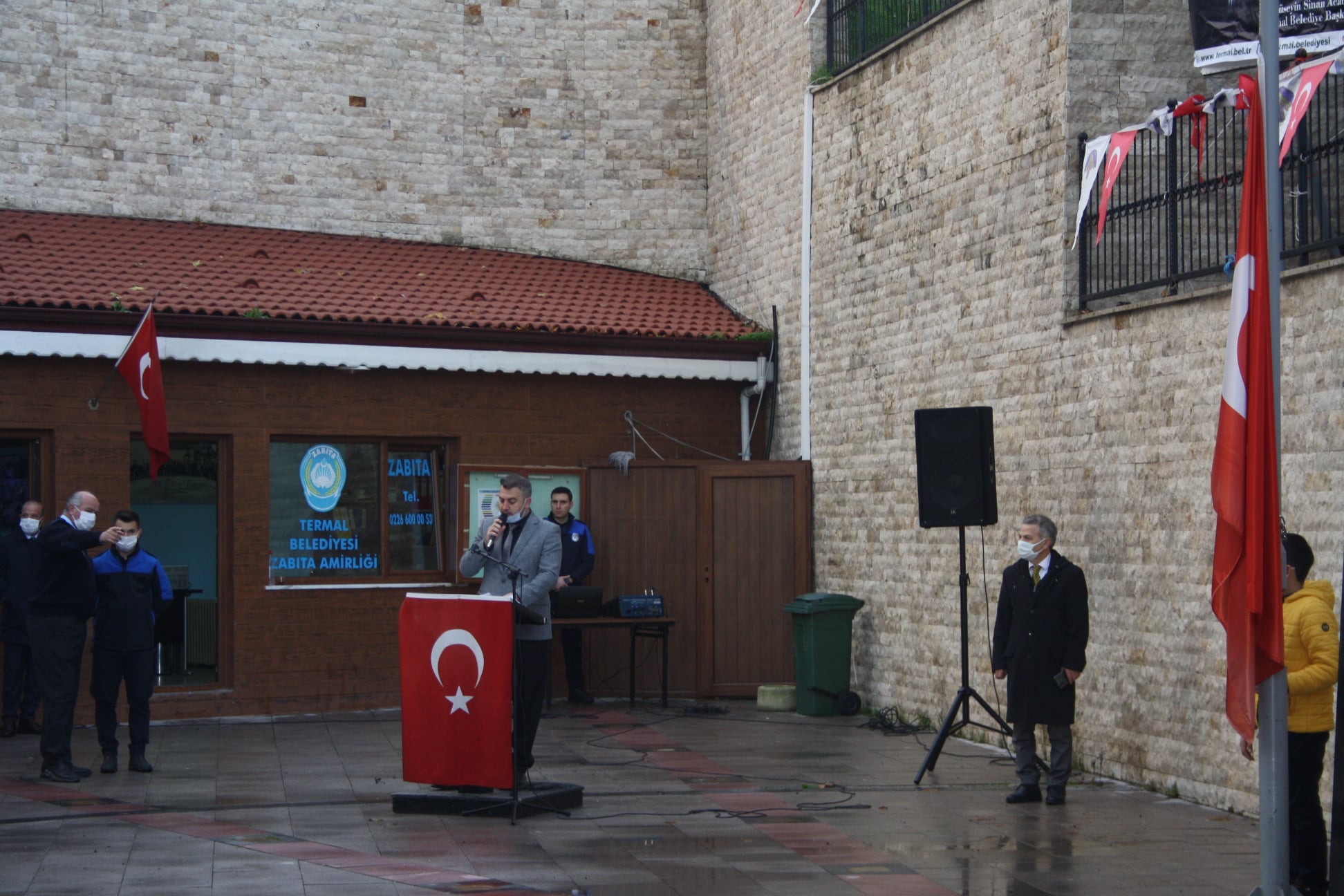 10 Kasım Atatürk'ü anma münasebeti ile Termal Meydan' da anma ve çelenk bırakma töreni gerçekleştirildi. Törene Belediye Başkanımız H.Sinan Acar' ın yanı sıra, Termal İlçe Kaymakamımız Vehbi Bakır, İlçe Jandarma Komutanı Çağrı İzci, İlçe Emniyet Amiri Rıdvan Demirel, İl Genel Meclis üyemiz Hüseyin Alfat, Belediye meclis üyelerimiz Çağlar Erdinç, Şenol Sezer, Ak Parti Termal İlçe Başkanı Recep Bahar, Chp Termal İlçe Başkanı Selahattin Aksoy, Mhp Termal İlçe Başkanı Murat Kösem, siyasi parti teşkilatları, İlçe protokolü ve halkımız katılım sağladı. Tören açılış konuşması ile başlayıp, çelenk bırakılması, saygı duruşu ve istiklal marşı ile son buldu. Termal Belediyesi olarak aramızdan ayrılışının 83.yılında Cumhuriyetimizin kurucusu Gazi Mustafa Kemal Atatürk'ü sevgi, saygı, rahmet ve özlemle anıyoruz.