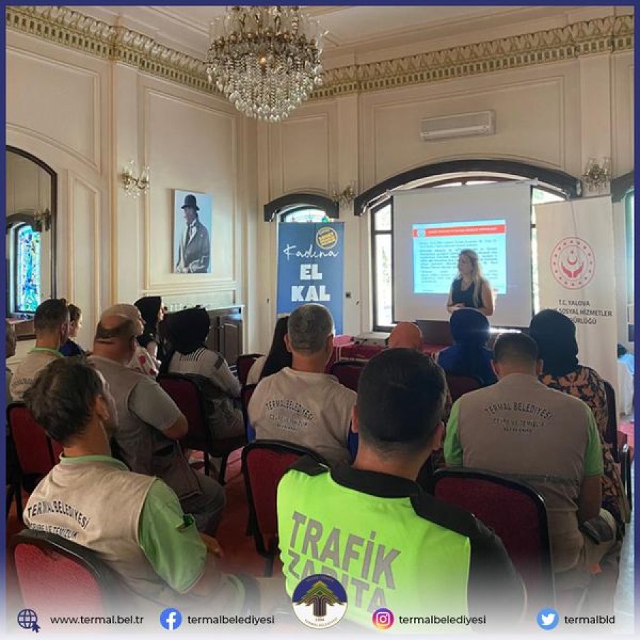 Yalova Aile ve Sosyal Hizmetler İl Müdürlüğü, Şiddet Önleme ve İzleme Merkezi (ŞÖNİM) tarafından, belediye başkanımız H.Sinan Acar ve belediye personelin katılımıyla yapılan, 'Kadına Şiddeti Önleme" eğitim Semineri'nde, Şiddet önleme ve izleme merkezi müdürlüğünde görevli Cennet Ertürk'ün konuyla ilgili bilgilendirmelerini dinledik.