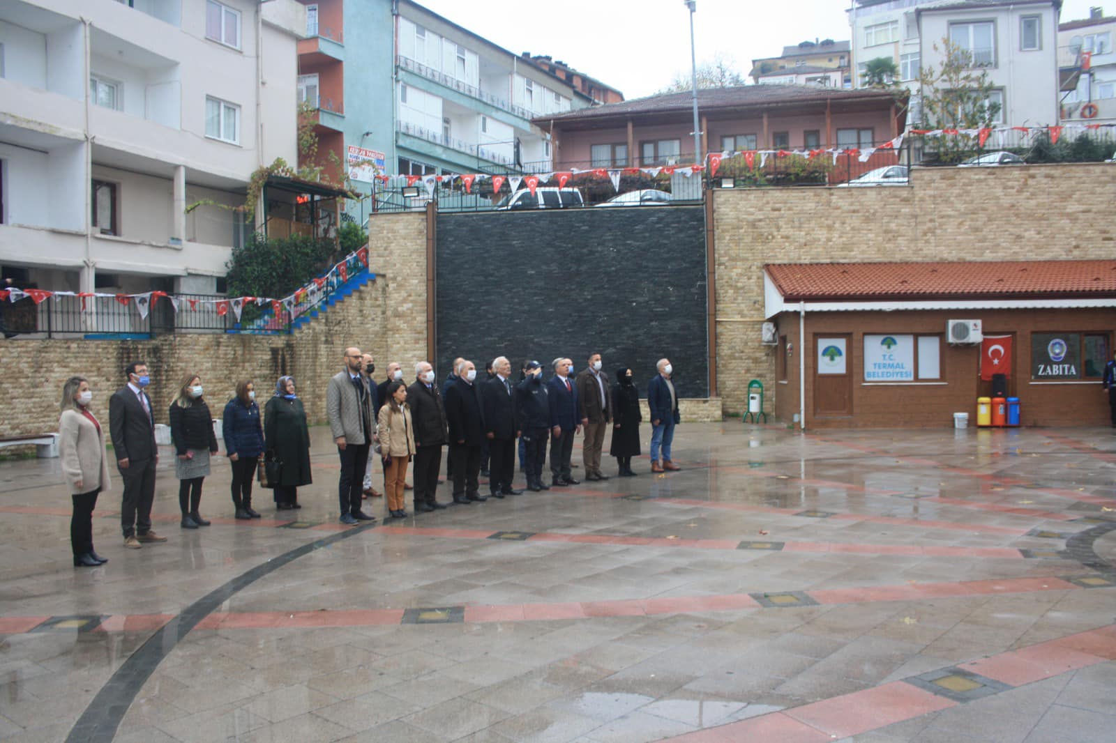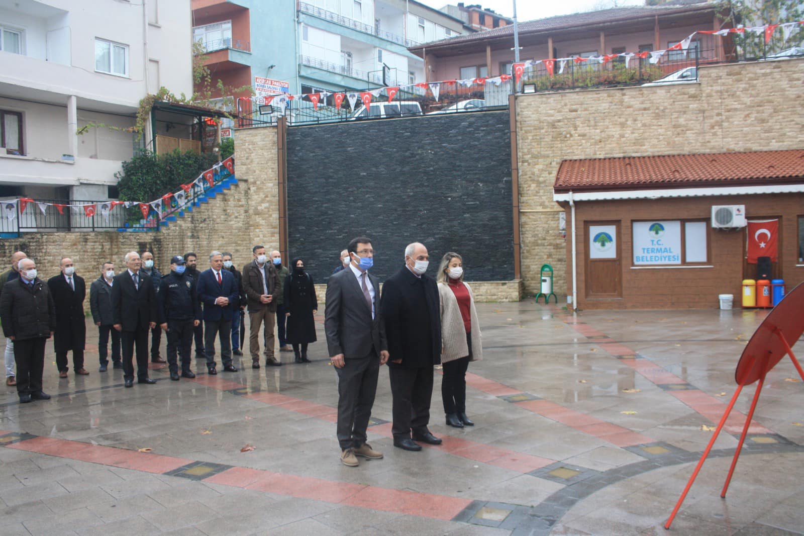 Belediye Başkanımız H.Sinan Acar, 24 Kasım Öğretmenler Günü kapsamında Termal ilçe meydanında düzenlenen törene katıldı. Saygı duruşu ve İstiklal Marşı ile başlayan tören çelenk bırakılmasının ardından son buldu. Törenin ardından, ilçemizde ve halkımızda büyük emekleri bulunan emekli öğretmen Mümin Kayar' a Belediye Başkanımız H.Sinan Acar, çiçek takdim ederek hatıra fotoğrafı çekildi. Termal Belediyesi olarak tüm öğretmenlerimizin Öğretmenler Günü' nü tekrardan kutlarız.