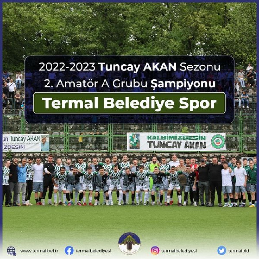 2022-2023 Tuncay AKAN Sezonu 2. Amatör A Grubu Şampiyonu olan Termal Belediye Spor kulübümüzü ve grubu 2. sırada tamamlayarak bir üst lige çıkmaya hak kazanan 1877 Üvezpınar Spor kulübümüzü tebrik ediyor. 1. Amatör Kümede başarılar diliyoruz.